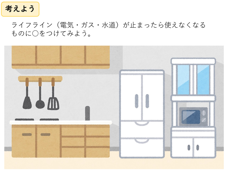- キッチンの図(絵)を見て、電気、ガス、水道が止まった時にどの機能が使えなくなるかを考える。
