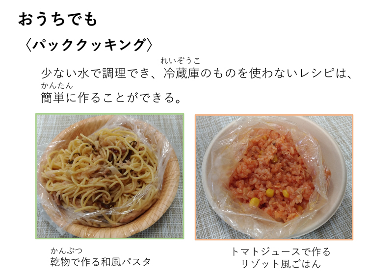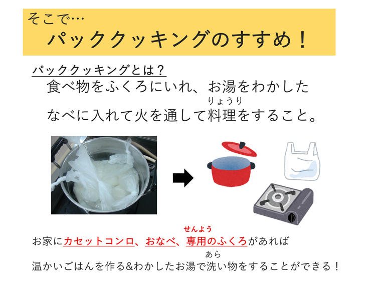 - 災害時にパッククッキングが有効であることを強調する。