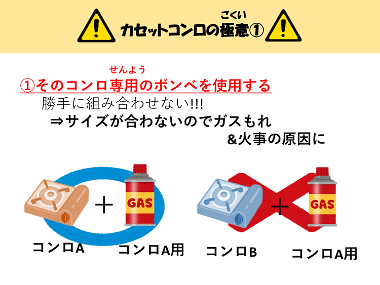 - カセットコンロの使用について実践。