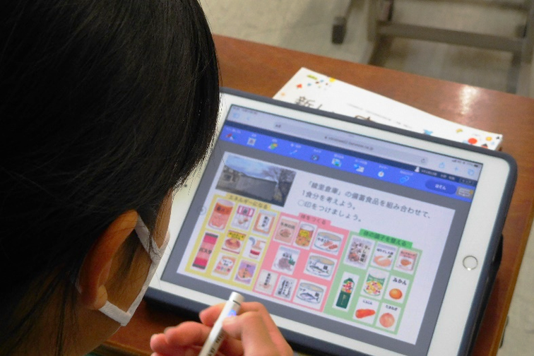 - 授業内容ロイロノート上でデジタル食材・備品イラストを用いて、児童自身の家庭を想定して「我が家の備蓄食品リスト」の作成を行いました。
