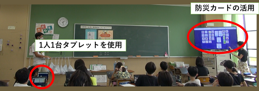 子どもたちは、栄養教諭の手作りの手洗いチェッカーを使って、衛生について学習しました。また、ロイロノートを活用して栄養バランスの良い備蓄食を考えました。