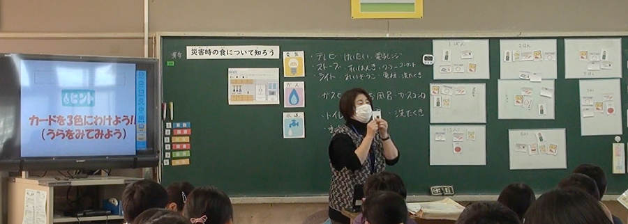 - 授業内容災害に備えて家庭での備蓄食品の準備やローリングストック法について学び、BOSAI カードXを活用して、三色の食品群をもとに、栄養バランスの良い食品・食事の組み合わせを考える学習活動を行いました。